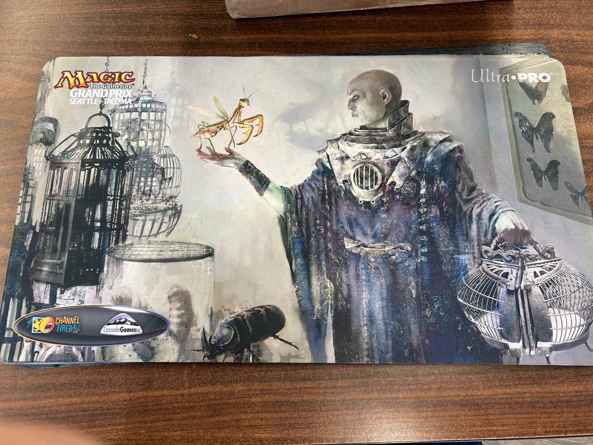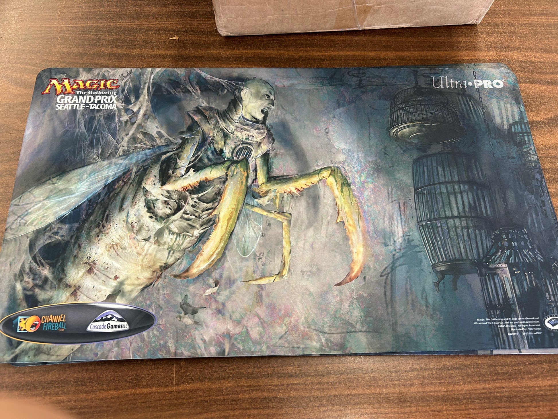 This playmat is double-sided, featuring the art of Delver of Secrets on the front, and Insectile Aberration on the back. As featured at Grand Prix Seattle-Tacoma, in November 2015.