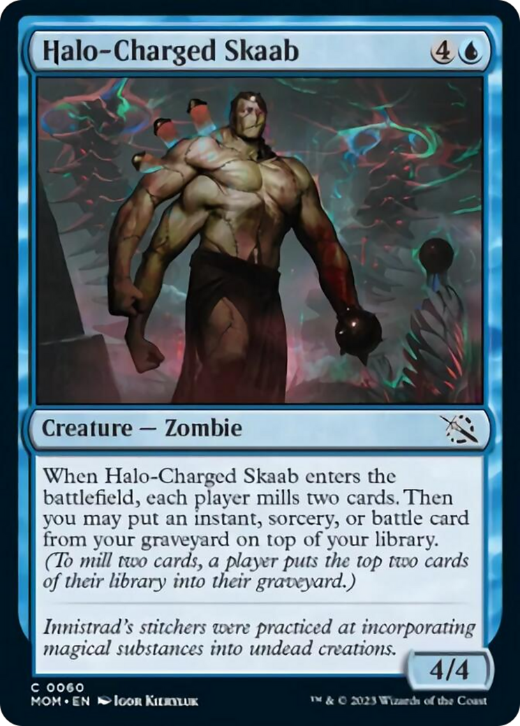 When Halo-Charged Skaab enters the battlefield, each player mills two cards. Then you may put an instant, sorcery, or battle card from your graveyard on top of your library. (To mill two cards, a player puts the top two cards of their library into their graveyard.)