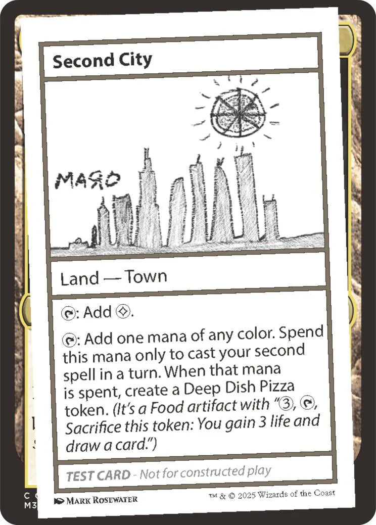 T: Add one mana of any color. Spend this mana only to cast your second spell in a turn. When that mana is spent, create a Deep Dish Pizza token. (It's a Food artifact with "3, T, Sacrifice this token: You gain 3 life and draw a card.")